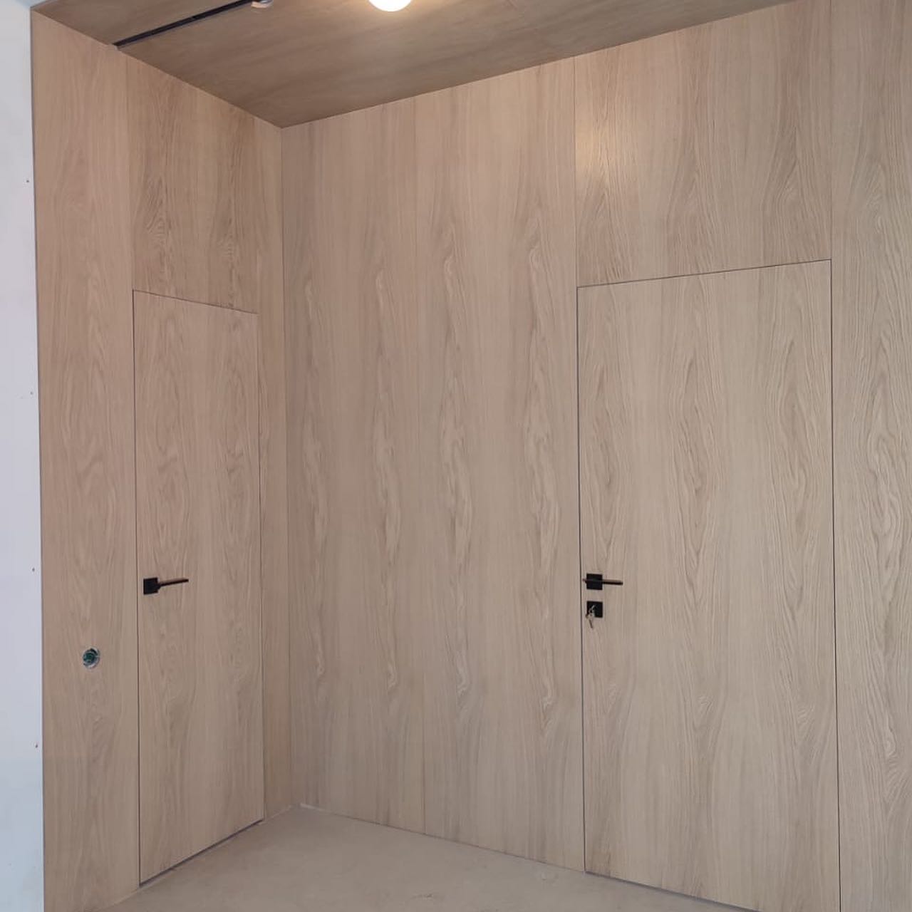 В проекте использовали: двери с компланарным погонажом и стеновые панели в натуральном шпоне "Песочный дуб". Такое стилистическое решение сейчас считается трендом и даёт волю для фантазии! P.S. Планируется ручная роспись дизайнером-декоратором, вызывает полный восторг!