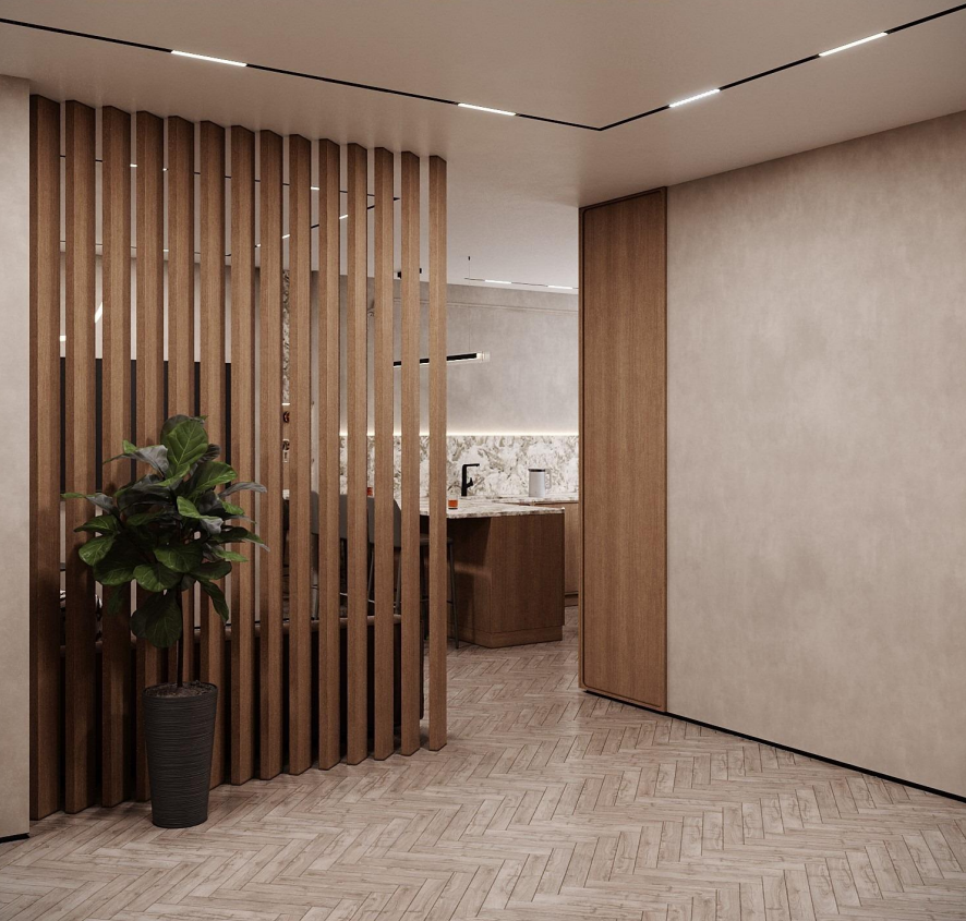 Этот стильный дизайн-проект выполнен в эстетике современного минимализма с использованием теплой бежево-коричневой палитры и натуральных фактур дерева и камня. Ключевым элементом, формирующим архитектурную чистоту пространства, стали межкомнатные двери скрытого монтажа из коллекции Secret от фабрики «Терем». Благодаря установке в одной плоскости со стеной и отсутствию наличников, эти двери идеально вписываются в концепцию «бесшовного» интерьера, визуально расширяя помещения. Такое решение позволяет не отвлекать внимание от декоративных деталей — реечных перегородок, мрамора на кухне и стильной подсветки. Использование дверей фабрики «Терем» подчеркивает высокий статус интерьера и помогает сохранить единство стиля во всей квартире, от прихожей до спальни. В результате пространство выглядит цельным, воздушным и технически безупречным.